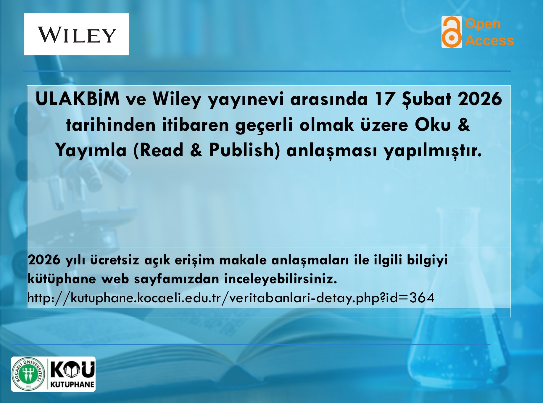 TÜBİTAK - Cambridge University Press arasında Oku & Yayımlama anlaşması yapılmıştır. Açık erişim makale yayınlama anlaşması kapsamında üniversitemiz akademisyenlerimiz sorumlu yazar (correspondig author) olmak kaydıyla kurumsal e-posta adresleri ile yayın yapabileceklerdir. Anlaşma hem hibrit dergiler hem de altın (gold/fully/tam) açık erişim dergilerde sınırsız açık erişim makale yayımlamayı kapsamaktadır. Kota: Yayımlanacak makale sayısında herhangi bir kota sınırlaması bulunmamaktadır. Ayrıntılı bilgi: http://kutuphane.kocaeli.edu.tr/veritabanlari-detay.php?id=364 ...